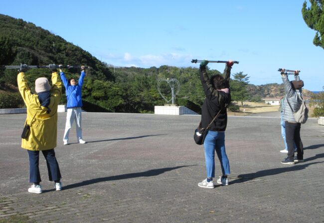 中央広場にて、ノルディックポールの使用方法や持ち方・歩き方を説明後、